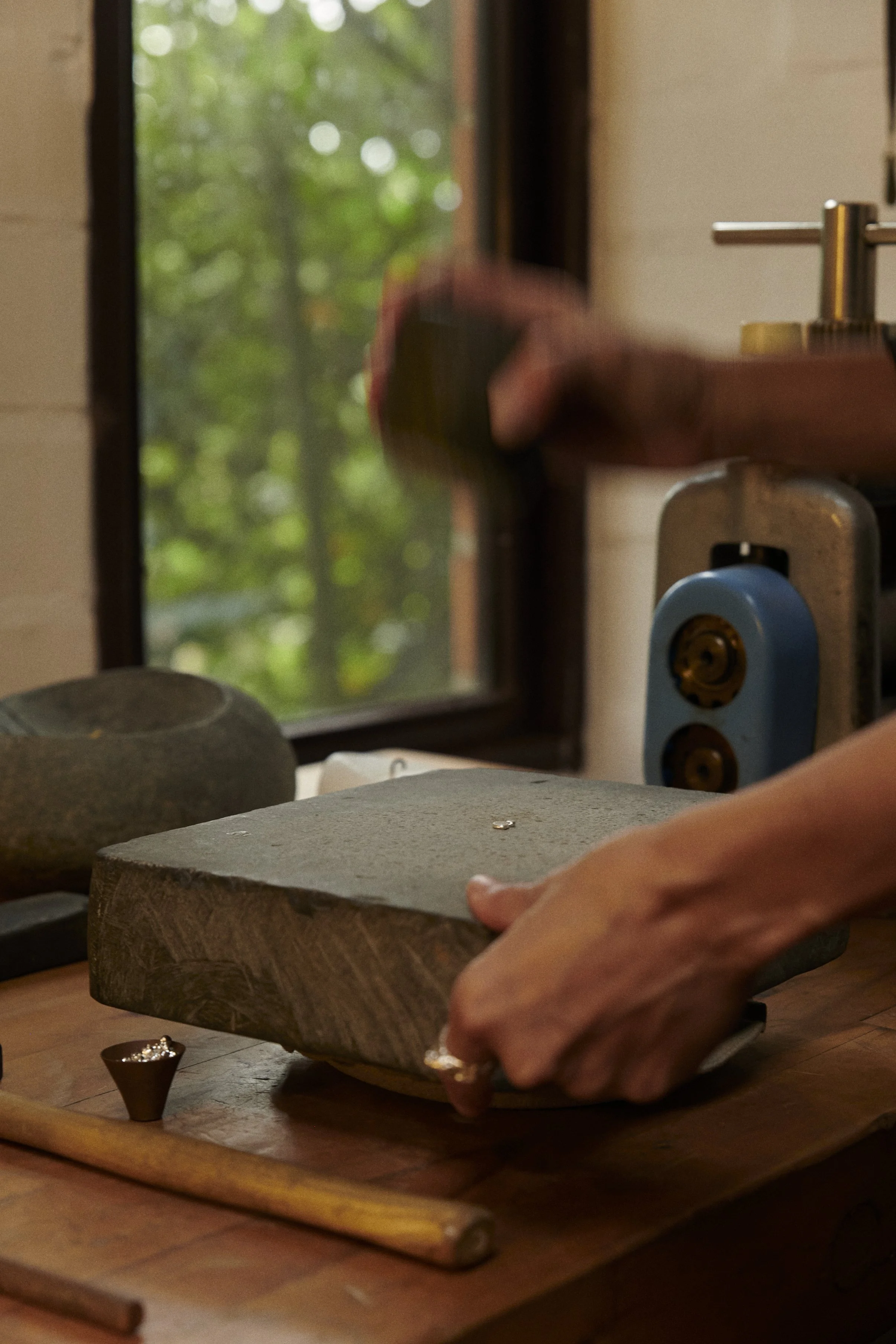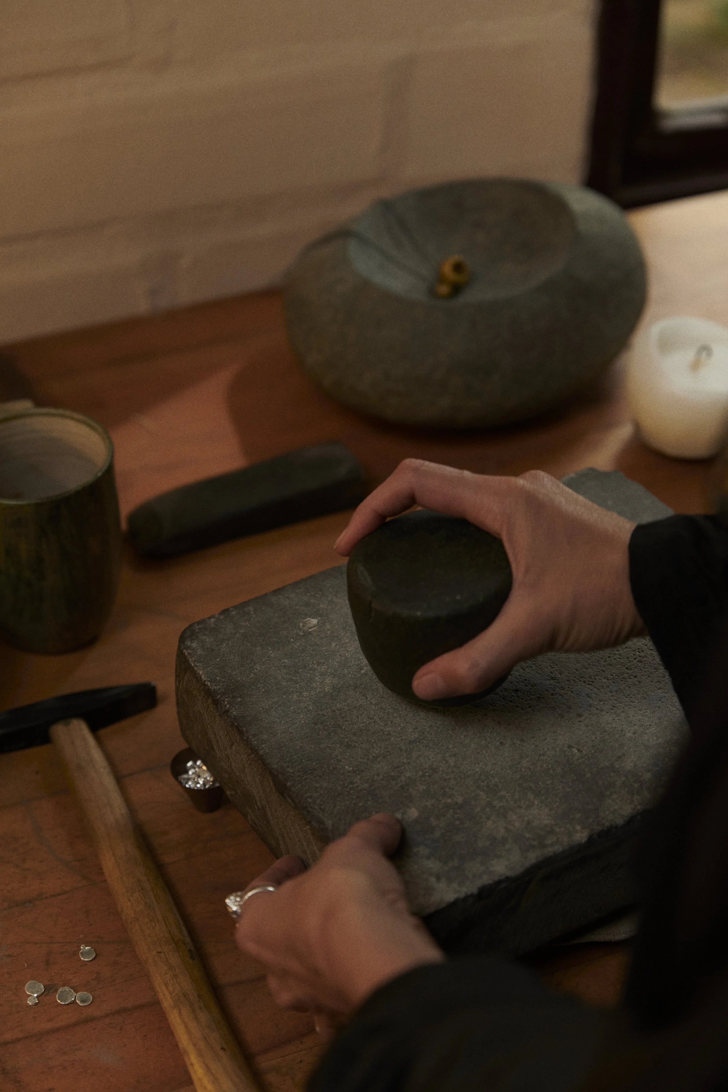 Exactly. Time and presence are everything for me. I’d rather hammer metal with stones for two hours than roll it in five minutes. With stones, your body becomes part of the process. It’s about time, intention, and relationship.