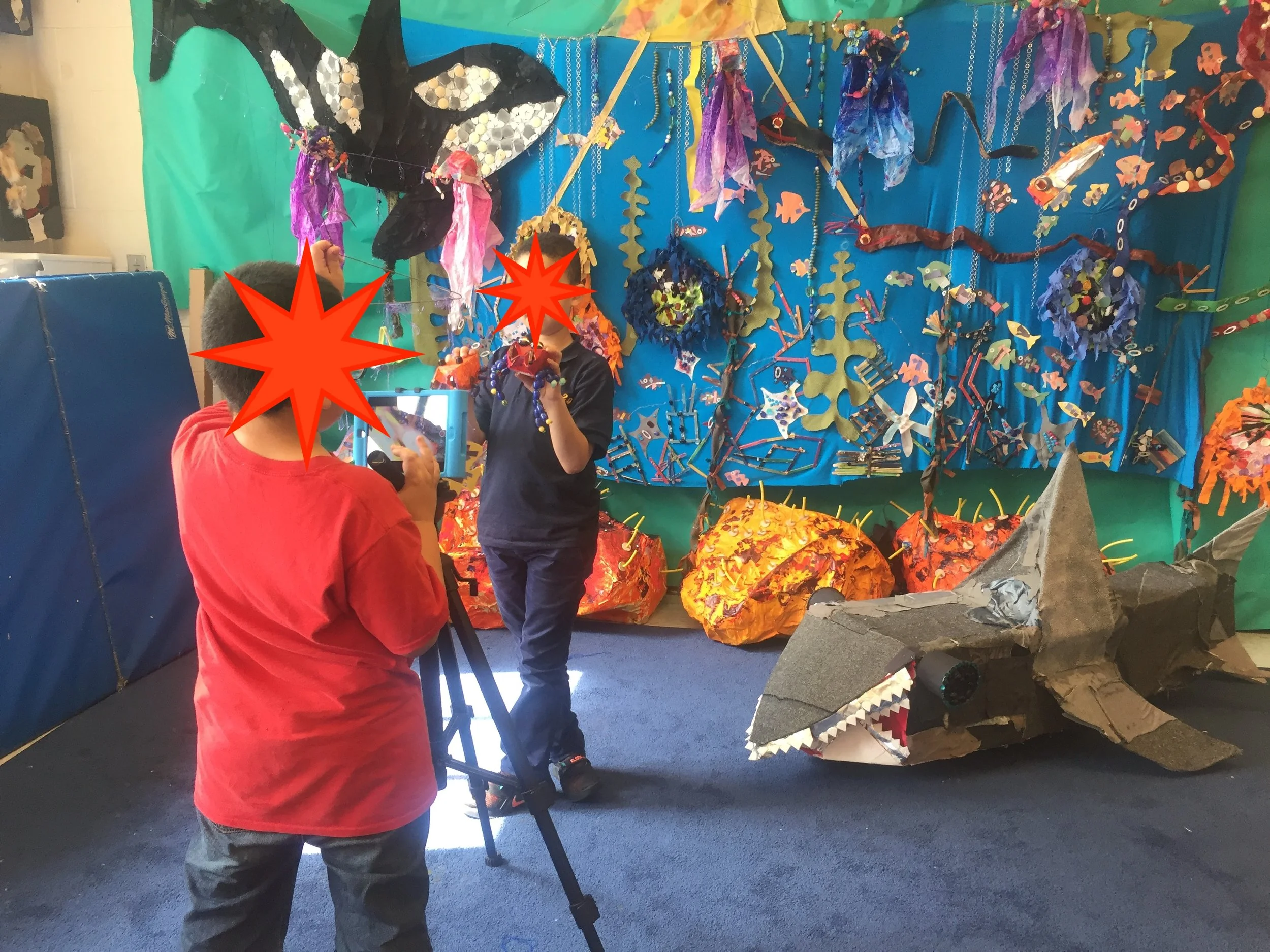 Fish made with milk cartons, zippers, buttons, CDs and Capri Sun containers